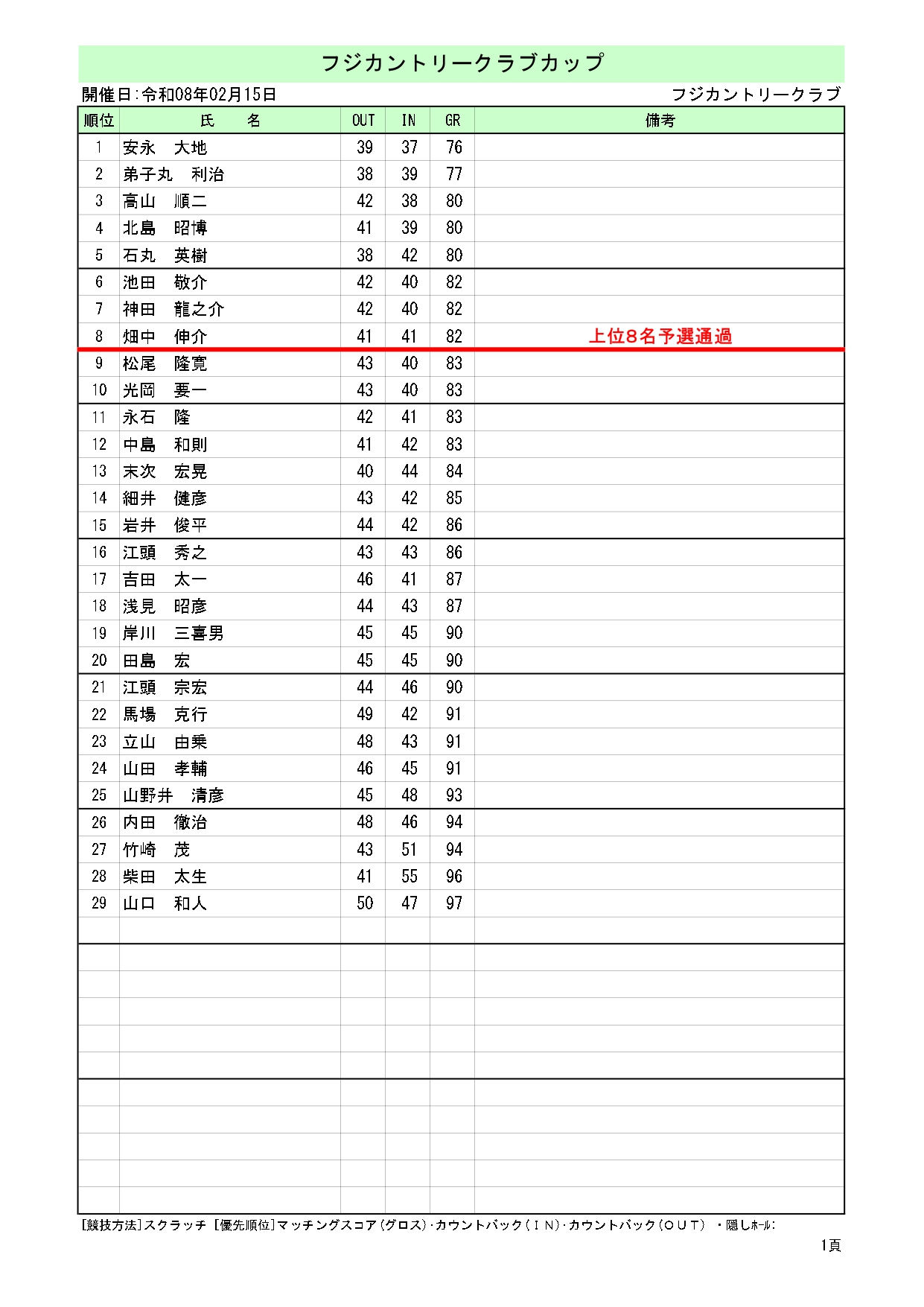 令和7年 フジカントリークラブカップ予選 1回戦開 催 日 令和8年2月15日(日曜日)開催コース フジカントリークラブ決勝ラウンド 令和8年2月22日(日曜日)スタート時間 8:16スタート【 成績表の拡大 】※スマートフォンの方は写真をクリックして下さい。※パソコンの方は画面下の「ダウンロード」をクリックして下さい。