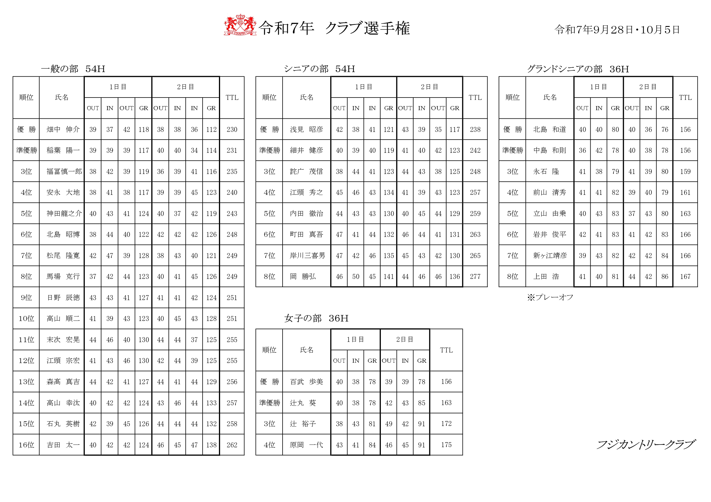 クラブ選手権を開催致しました。成績表と優勝した方の写真を掲載しております。令和7年 クラブ選手権 決勝 結果開 催 日 令和7年10月5日(日曜日)開催コース フジカントリークラブ