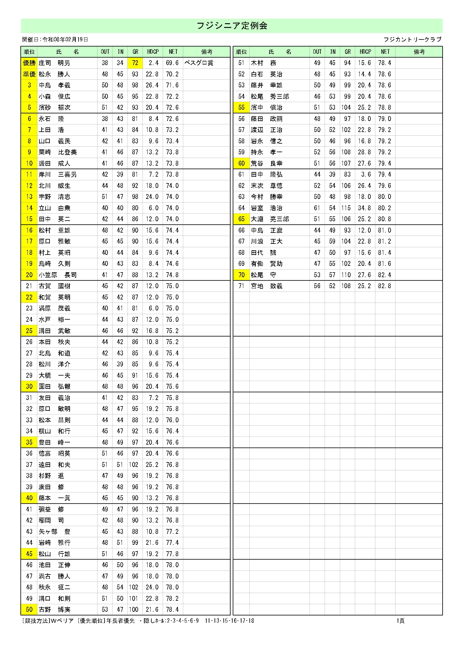 2月19日フジシニア定例会成績フジシニア定例会を開催致しました。成績表を掲載しております。【 成績表の拡大 】※スマートフォンの方は写真をクリックして下さい。※パソコンの方は画面下の「ダウンロード」をクリックして下さい。成績表を掲載しております。