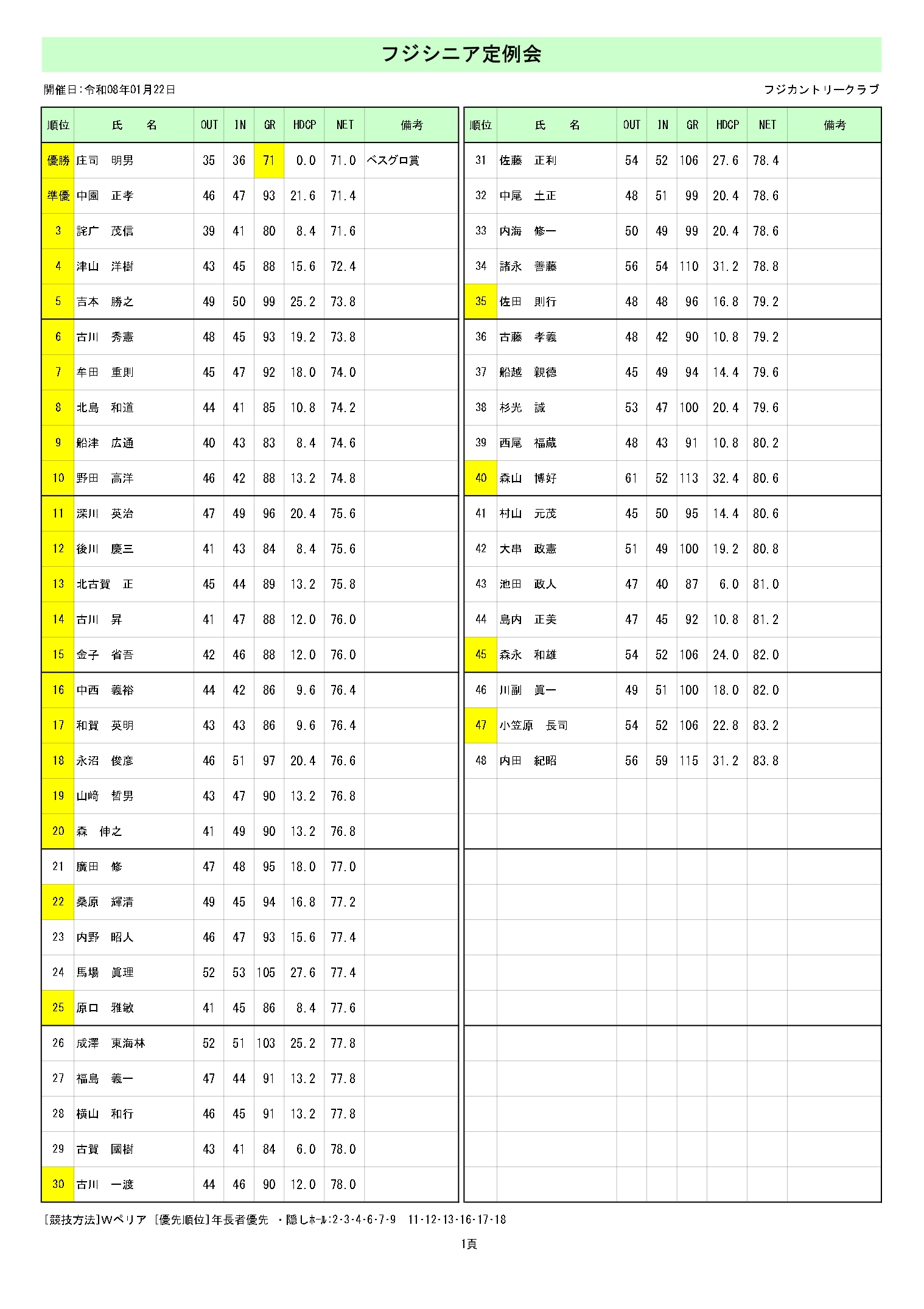 1月22日フジシニア定例会成績フジシニア定例会を開催致しました。成績表を掲載しております。【 成績表の拡大 】※スマートフォンの方は写真をクリックして下さい。※パソコンの方は画面下の「ダウンロード」をクリックして下さい。成績表を掲載しております。