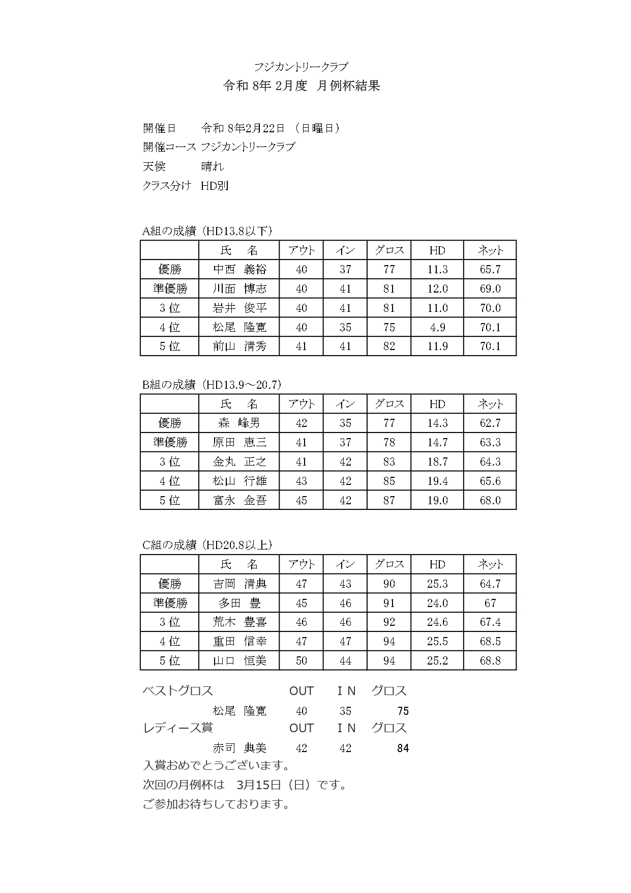 令和8年 2月度 月例杯結果