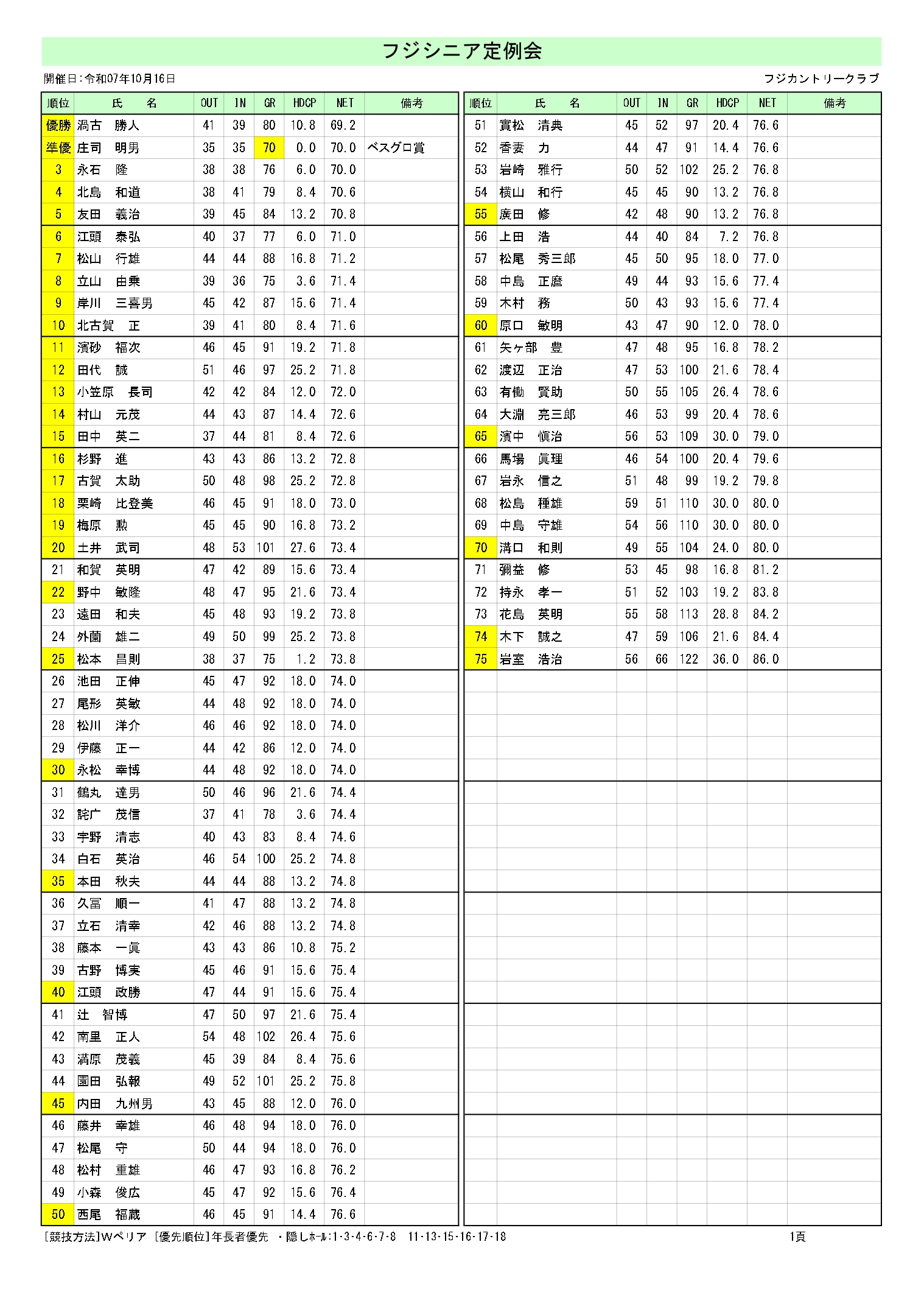 10月16日フジシニア定例会成績フジシニア定例会を開催致しました。成績表を掲載しております。【 成績表の拡大 】※スマートフォンの方は写真をクリックして下さい。※パソコンの方は画面下の「ダウンロード」をクリックして下さい。成績表を掲載しております。