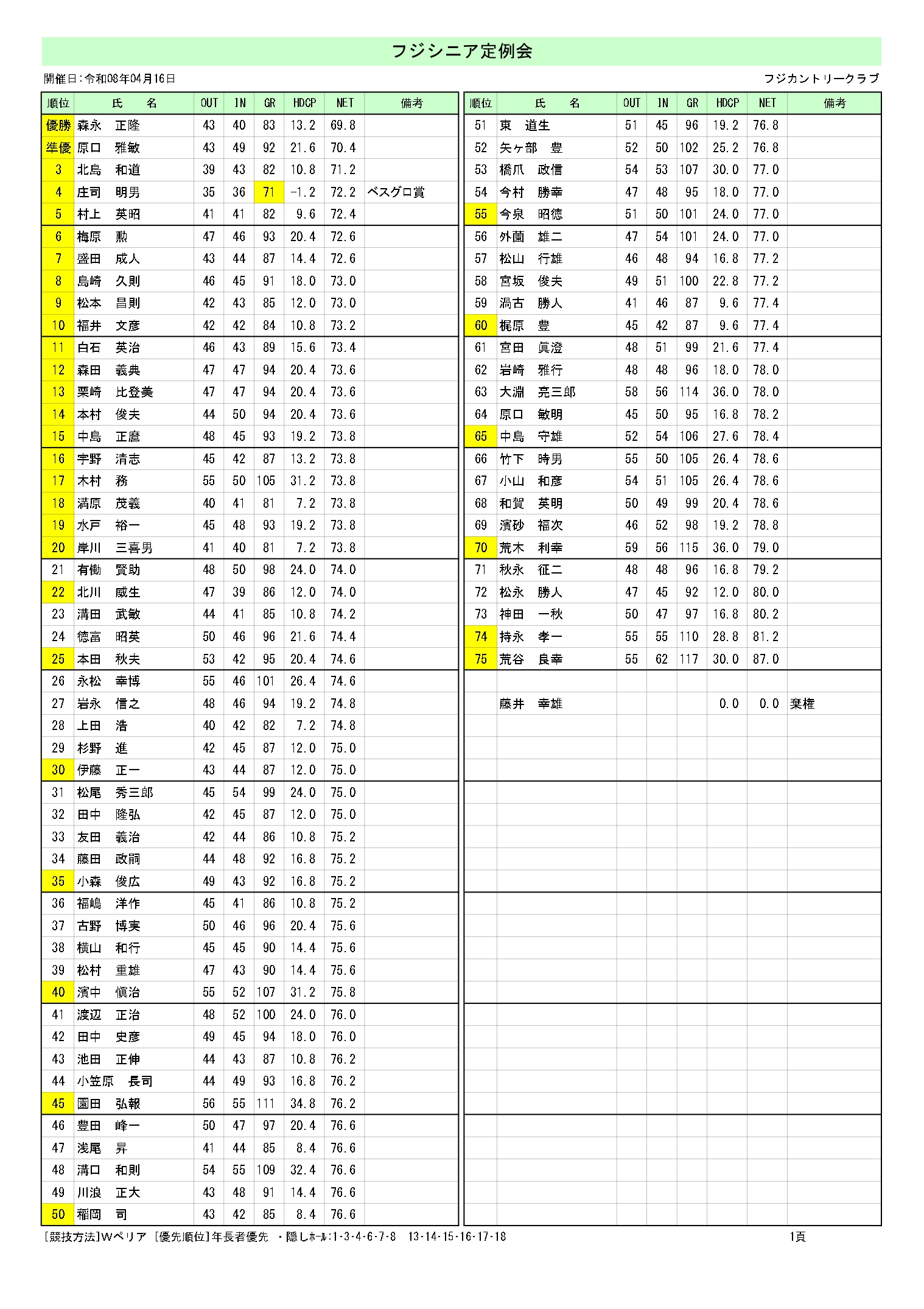 4月16日フジシニア定例会成績フジシニア定例会を開催致しました。成績表を掲載しております。【 成績表の拡大 】※スマートフォンの方は写真をクリックして下さい。※パソコンの方は画面下の「ダウンロード」をクリックして下さい。成績表を掲載しております。