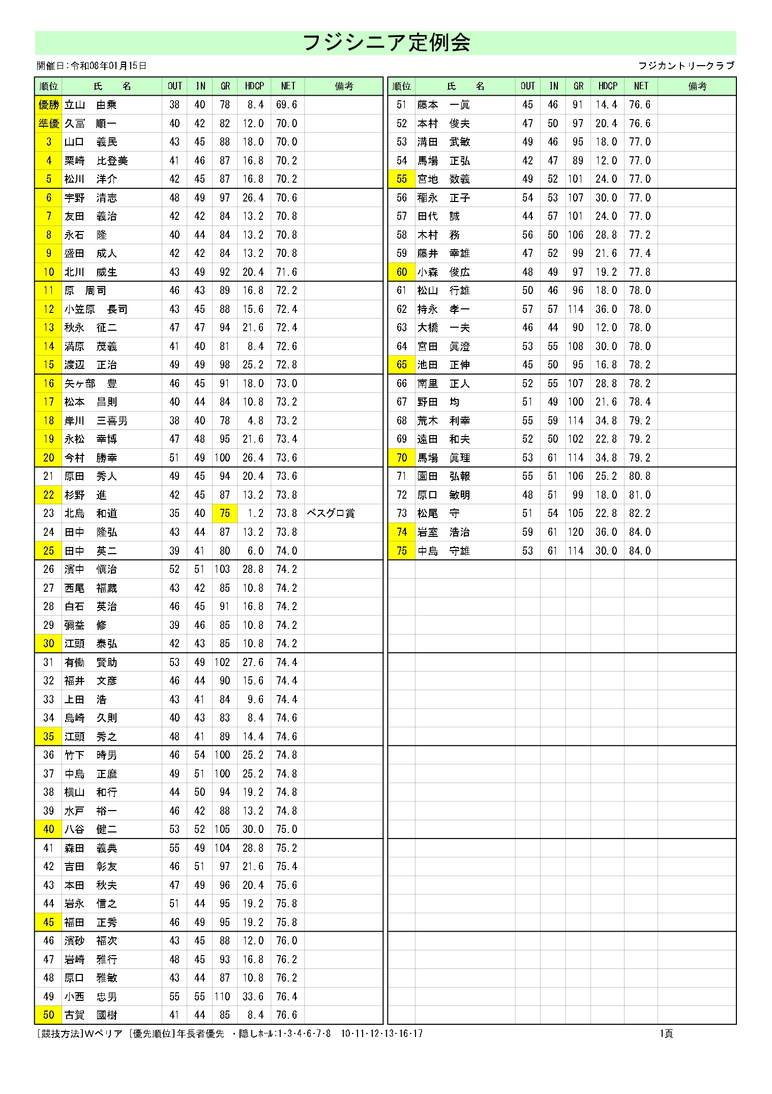1月15日フジシニア定例会成績フジシニア定例会を開催致しました。成績表を掲載しております。【 成績表の拡大 】※スマートフォンの方は写真をクリックして下さい。※パソコンの方は画面下の「ダウンロード」をクリックして下さい。成績表を掲載しております。