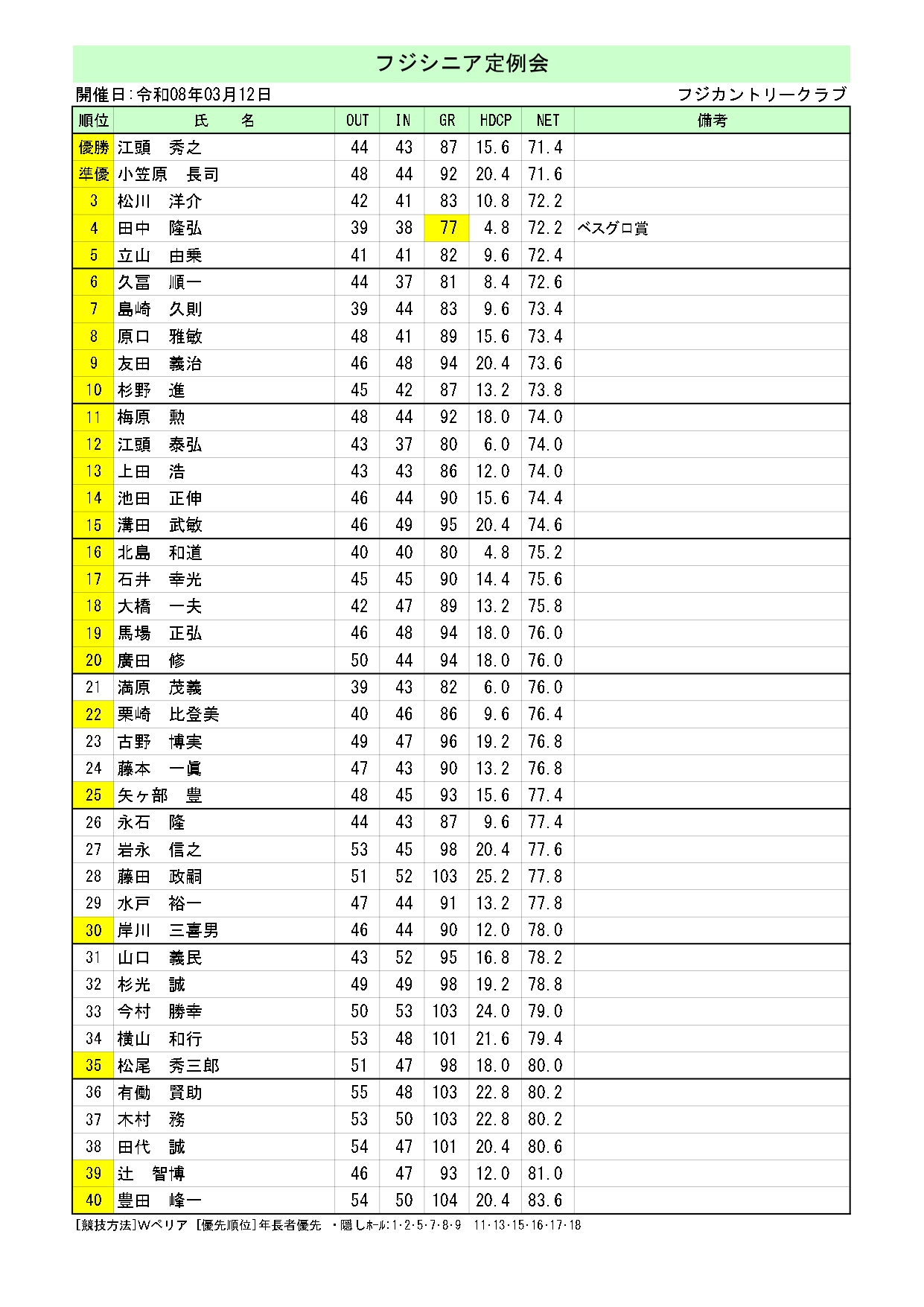 3月12日フジシニア定例会成績フジシニア定例会を開催致しました。成績表を掲載しております。【 成績表の拡大 】※スマートフォンの方は写真をクリックして下さい。※パソコンの方は画面下の「ダウンロード」をクリックして下さい。成績表を掲載しております。