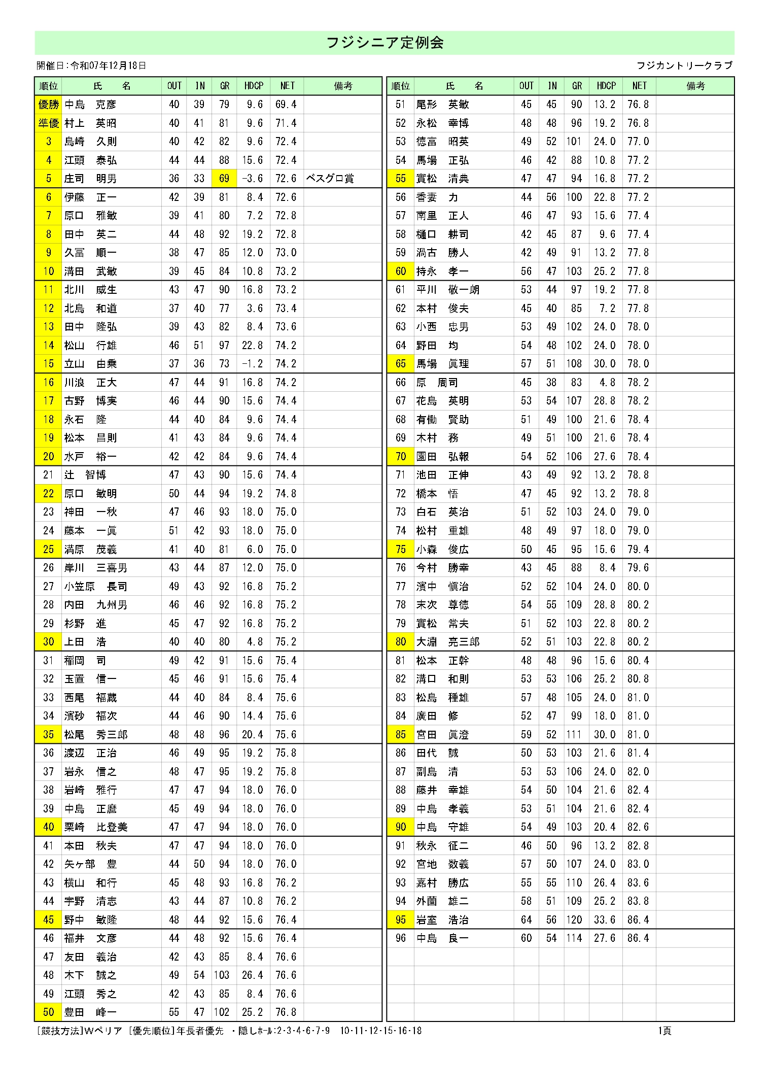 12月18日フジシニア定例会成績フジシニア定例会を開催致しました。成績表を掲載しております。【 成績表の拡大 】※スマートフォンの方は写真をクリックして下さい。※パソコンの方は画面下の「ダウンロード」をクリックして下さい。成績表を掲載しております。
